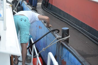 Ed begint met het poetsen aan de buitenkant van de boot, want hij is hier en daar behoorlijk zwart en vet na het aanleggen langs het bunker schip om te tanken.