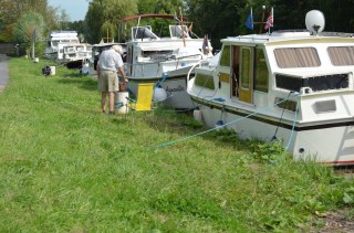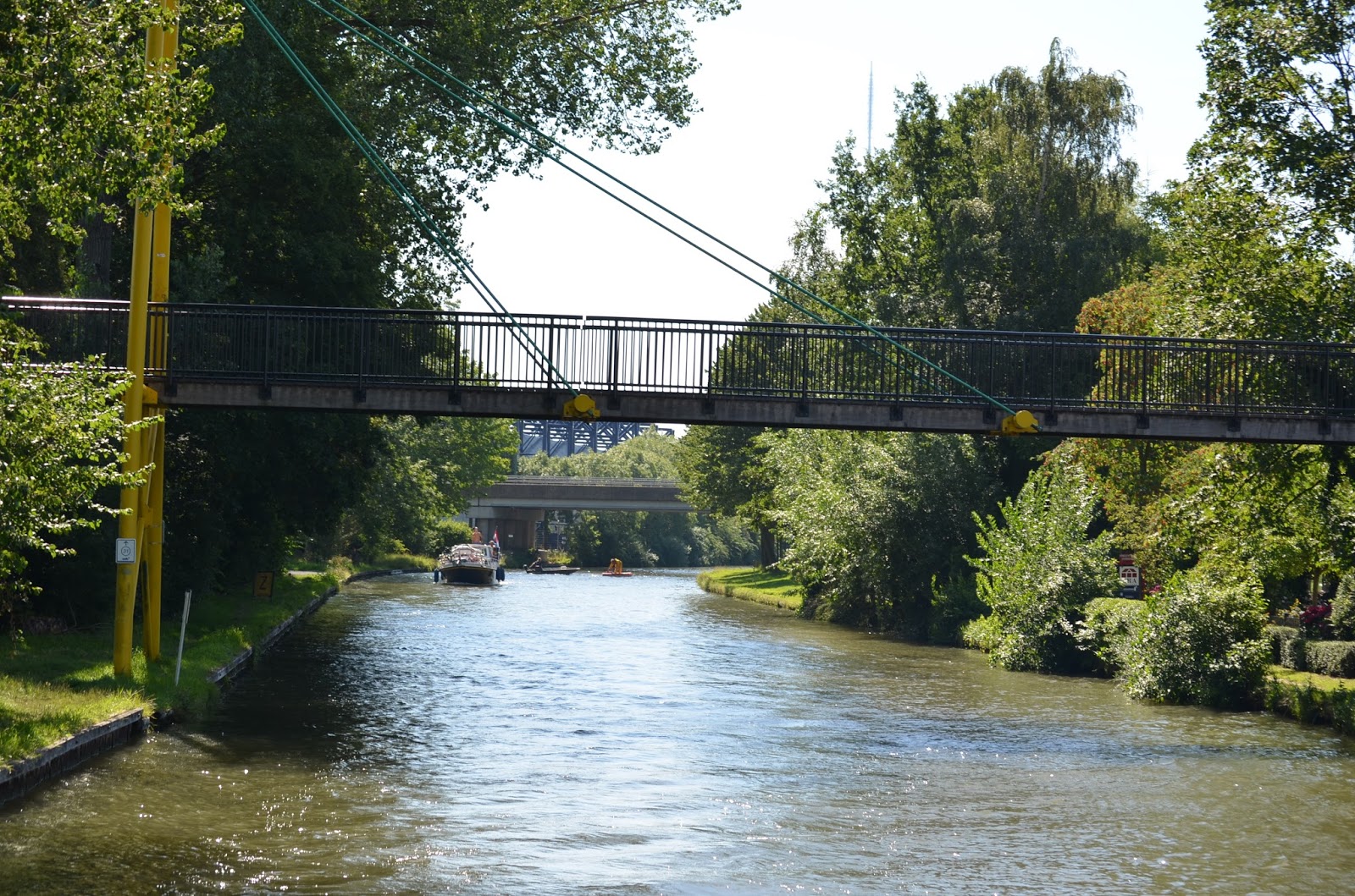 Op gegeven moment komen we allerlei bruggen tegen waar we om bediening moeten vragen. Dan blijkt er voor ons een grote huurboot te varen die dit niet begrijpt. Bij hoge spoorbruggen waar je makkelijk onder kan blijft hij stil liggen, we snappen er niets van maar zij begrijpen er helemaal niets van!!