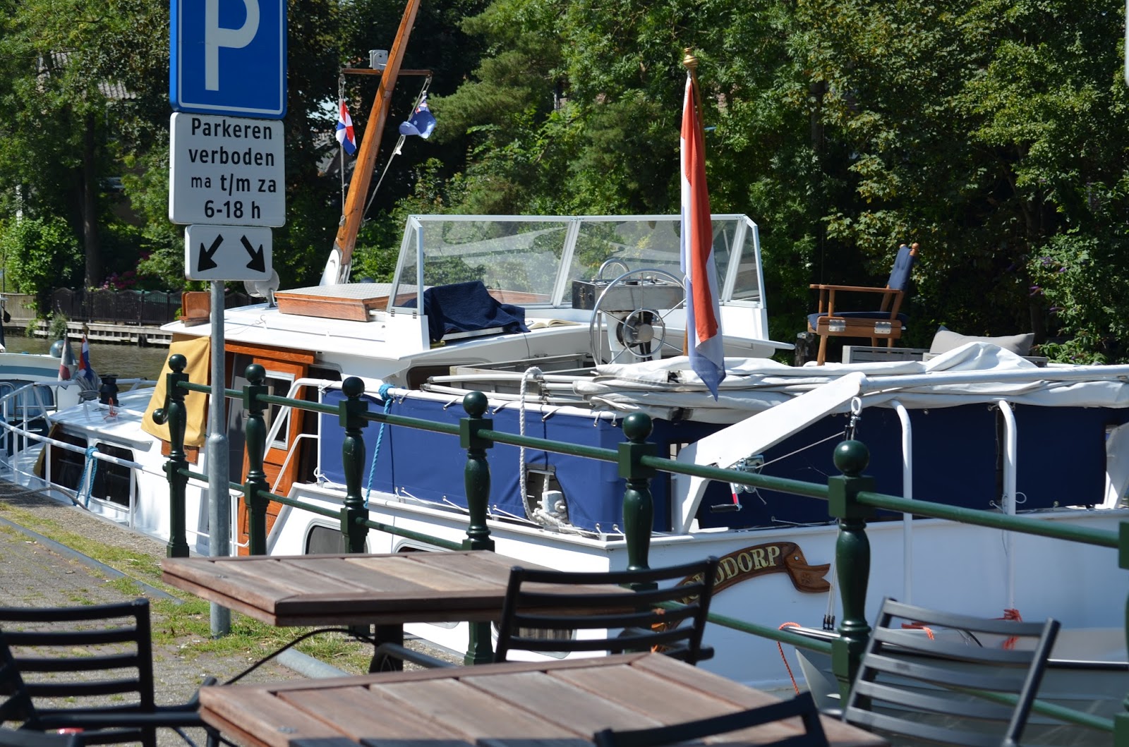 De zon schijnt we besluiten in Gouda te blijven zomaar ergens langs de kant waar het wel is toegestaan dit keer.