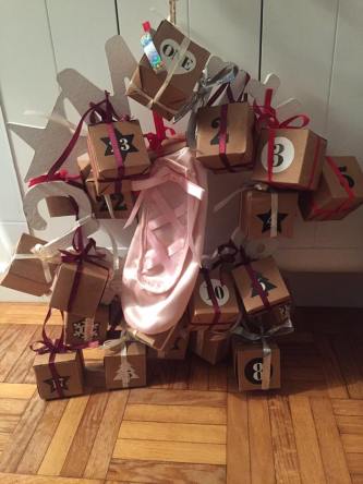 Dit heb ik in de doosjes gedaan, deze waren al voorzien van getallen en zo heb ik de doosjes met lint vast gemaakt. In het midden had een vriendin heel leuk een balletschoen etui gedaan. (Dochterlief studeert dans in Parijs, dus hoe toepasselijk!)