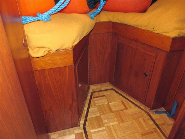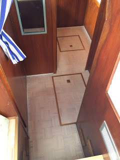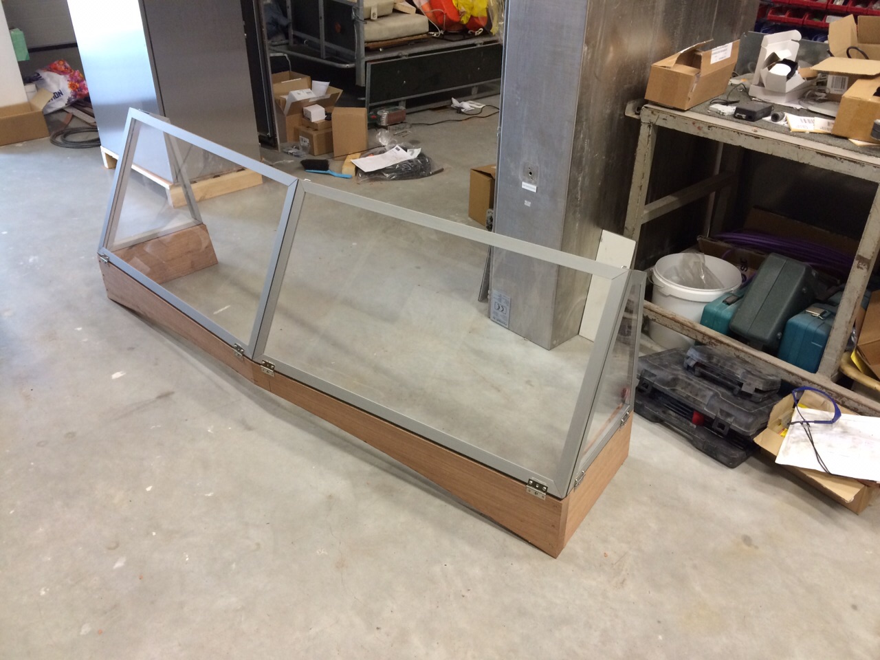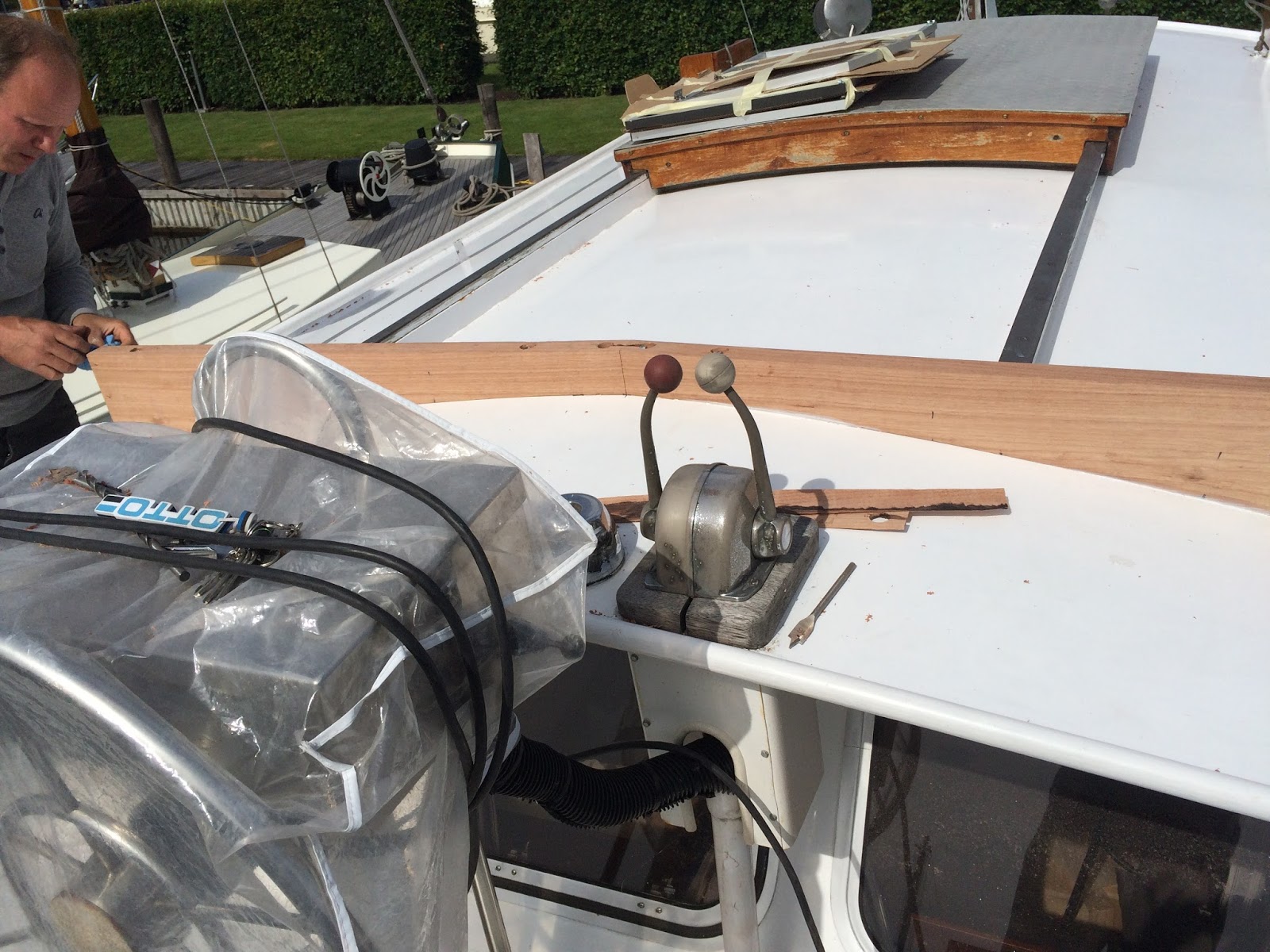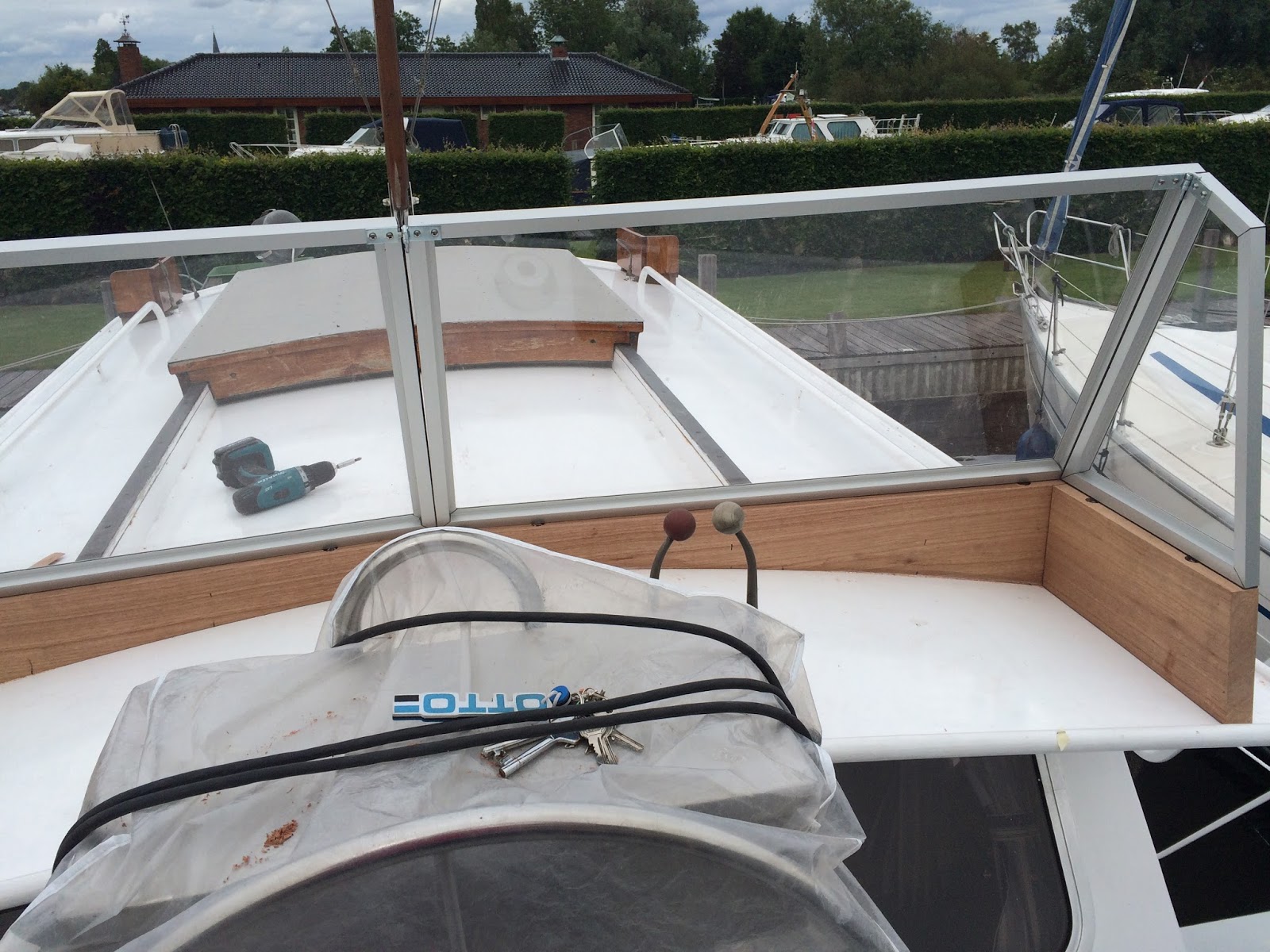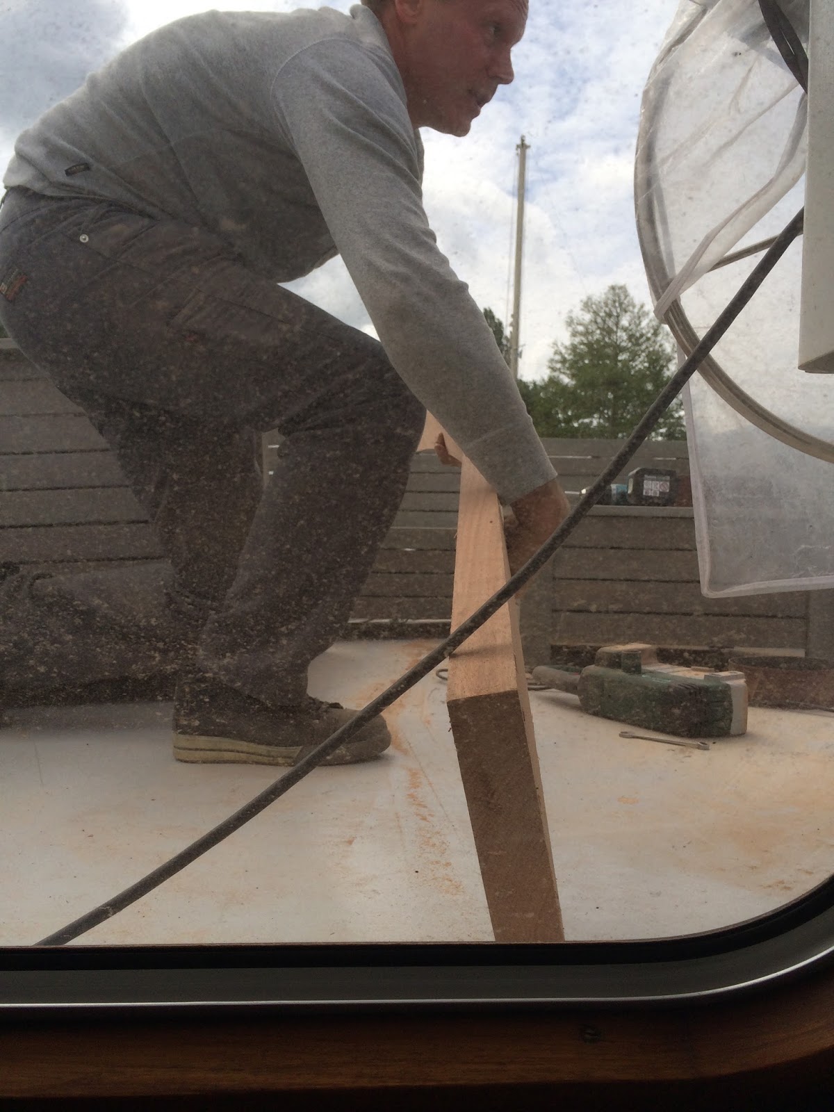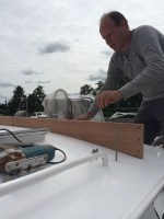 Ed is zoals eerder gezegd erg handig en besluit dit zelf te gaan maken. Hij timmert een houten frame die hij op maat heeft gemaakt op het bovendek waar het windscherm op gemonteerd wordt.