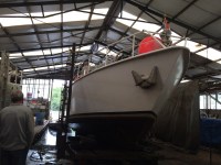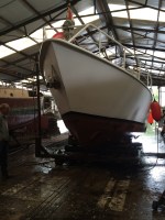 We lopen rondom de boot en inspecteren wat er allemaal moet gaan gebeuren. We tijdens het varen een gezonken sloep geraakt hierdoor is het blad van de schroef aan bakboord kant beschadigd maar we hadden het erger verwacht.
