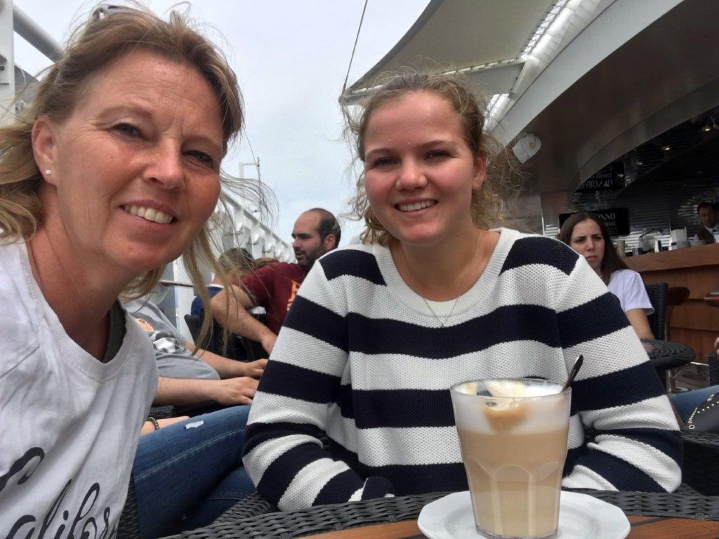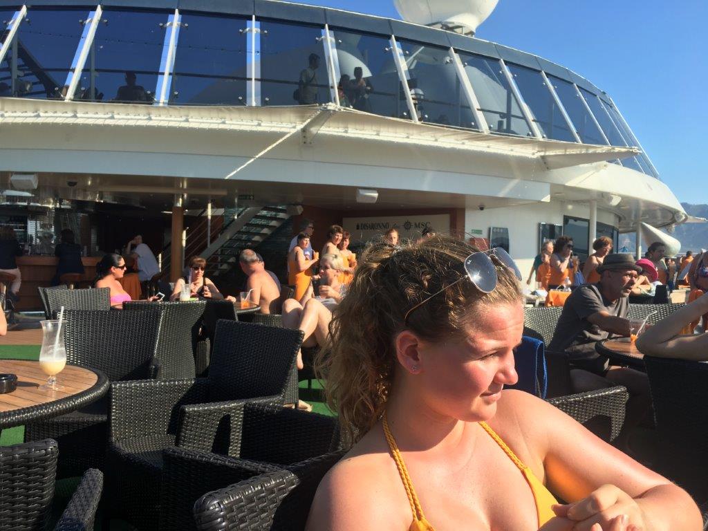 Daarna zijn we naar de hut (wat later zelfs een suite bleek) gegaan waar onze koffers al klaar stonden, en hup in onze zomerkleding lekker over de dekken wandelen om vervolgens aan dek wat te gaan drinken.