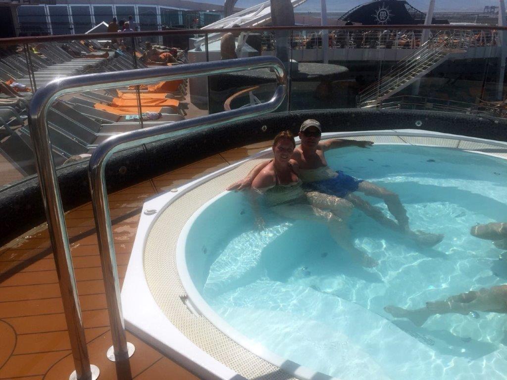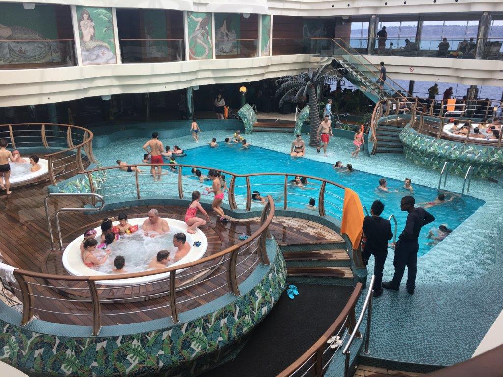 Vandaag komen we wat later op de dag aan om 1300. We kunnen nog heerlijk genieten bij het zwembad en terras op het schip. Ondanks dat er zoveel mensen aan boord zijn totaal incl. crew 4000 merk daar weinig van er zijn overal genoeg bedjes en stoelen en plekken om te vertoeven. Ook zijn er 5 mega zwembaden zowel binnen als buiten met glijbaan en tig bubbelbaden er is zoveel te doen en te zien en eerlijk gezegd komen we er niet eens aan toe.