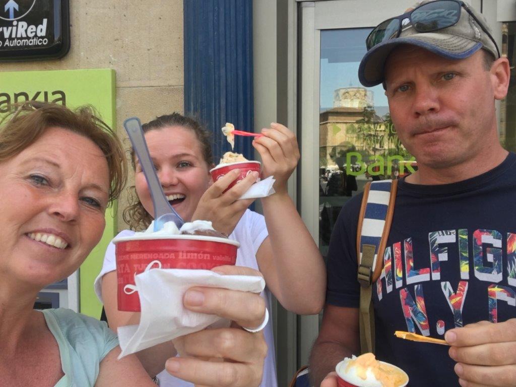 Na een lange rit laten we ons terugvoeren naar Plaza Reina waar we ook zijn opgestapt. We pikken hier een terras en eten overheerlijk tapas in de volle zon. De zon is echt over aanwezig en we moeten echt blijven smeren. We nemen nog heerlijk wat te drinken en besluiten nog wat te gaan wandelen we kopen nog een ijsje. Ook hier wil de souvenirjacht niet echt lukken maar hebben we een prachtig mooie dag beleefd en weten we zeker dat we hier nog een keer voor wat langere tijd naar toe terug gaan.