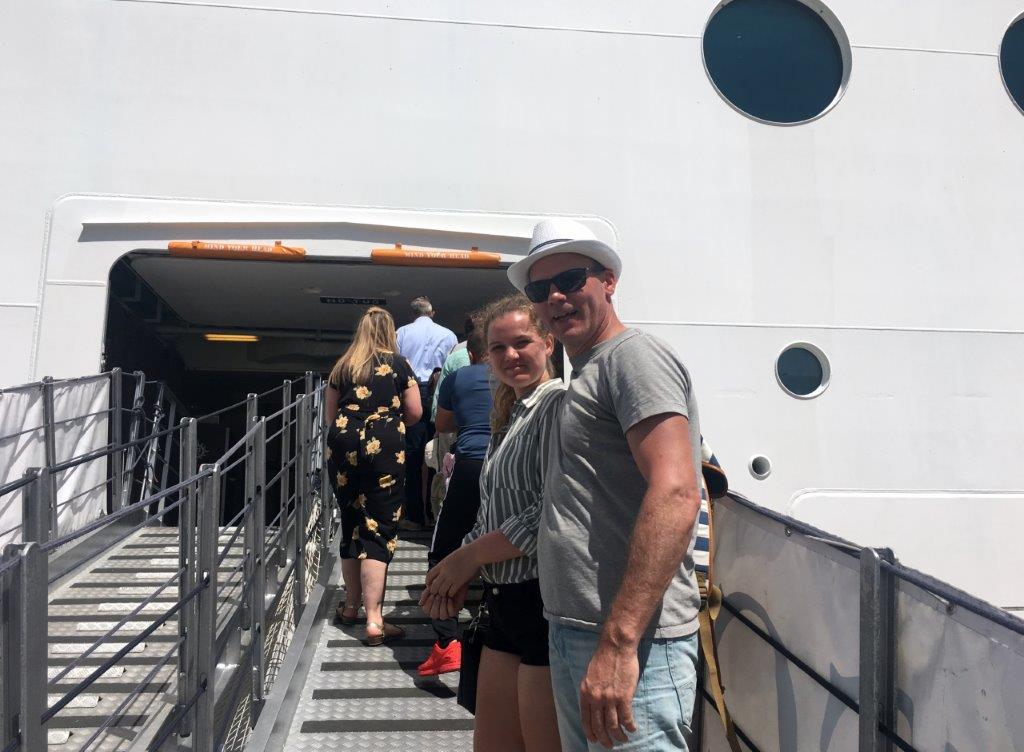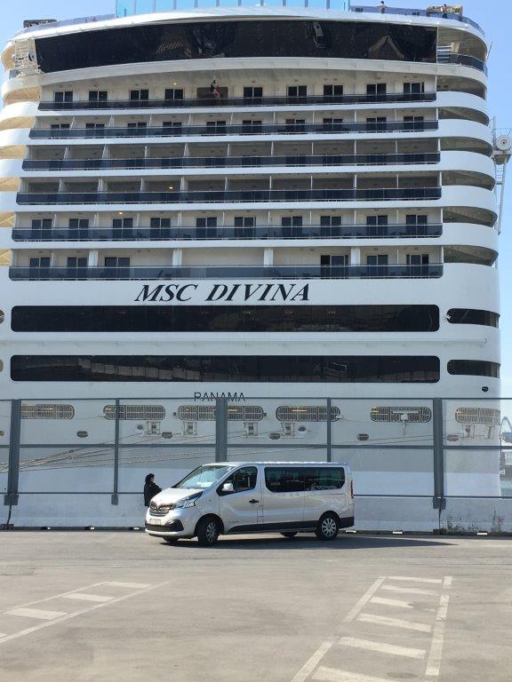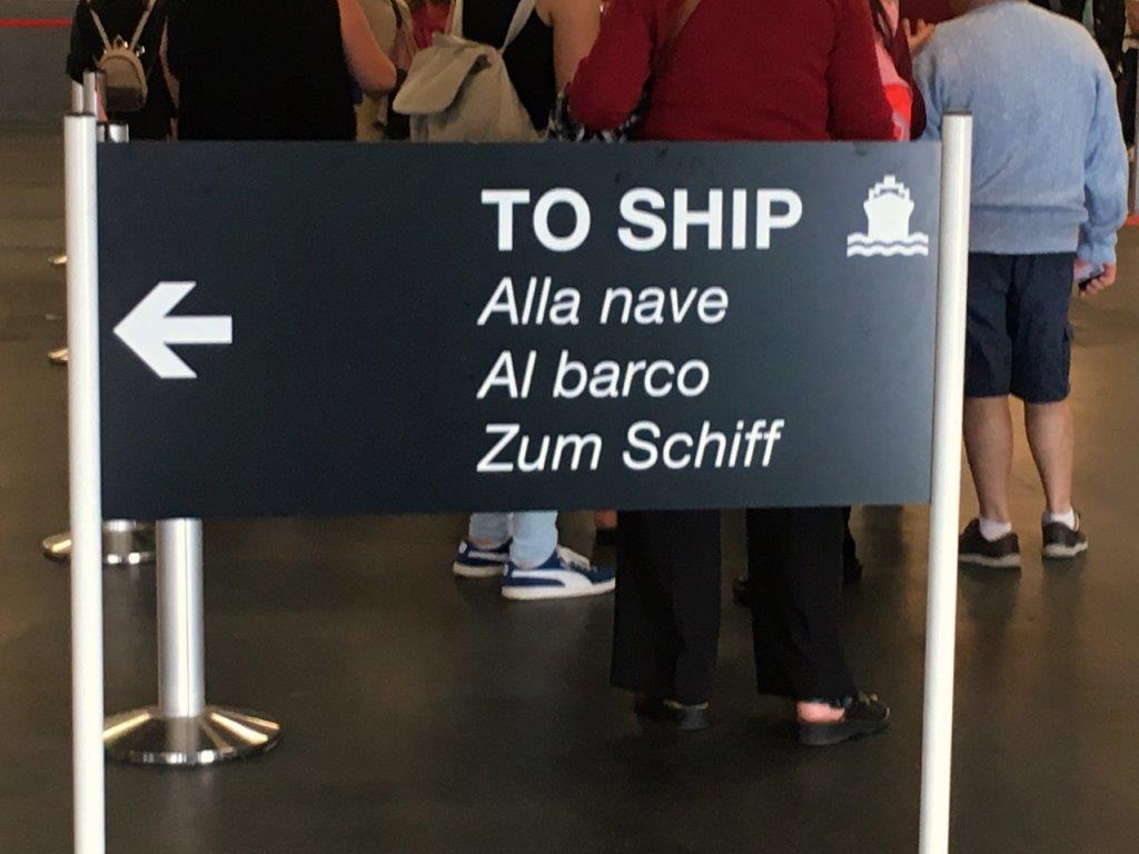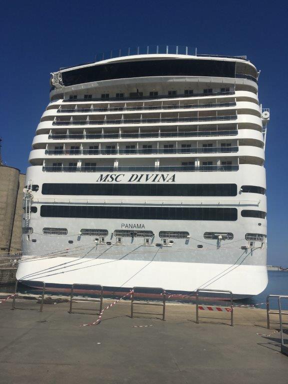 De haven was gemakkelijk te vinden en alles stond goed aangegeven dus dit keer ging het redelijk feilloos en kwamen precies uit waar we wilde zijn. We reden de haven in, daar werden onze koffers uitgeladen en op een kar gezet. Deze werden naar het schip gebracht en uiteindelijk zouden wij ze pas later weer terug zien in onze hut. Ik was alweer helemaal in mijn Italiaanse sfeer en kon mijn hart ophalen aan de Italiaans taal. De auto werd overgenomen door een Italiaanse maffiabaas. Deze moesten we in goed vertrouwen afstaan en zouden we aan het eind van de vakantie weer terug zien net als de autosleutels. Dat was wel even een dingetje voor manlief, hij heeft zijn Duitse bak net en is er nog al zuinig op. Maar ik herinnerde hem aan het moment in Palermo waar wij ook de sleutels af moesten geven aan een maffia baas om aan het eind van de dag te hopen dat we hem weer terug zouden krijgen. Hij heeft onderweg nog wel op zijn telefoon app. gekeken of zijn auto niet verplaats was en of de kilometerstand klopte, hoe bedoel je loslaten het komt best goed ? Ook dat was goed verlopen dus “have faith”, was mijn moto ging ook hier weer op. Ik wilde natuurlijk niet zeggen bij het achterlaten, maak nog maar ff een foto en kijk er nog maar eens goed naar… maar het lag wel op het puntje van mijn tong. Op een of andere manier wordt mijn soort humor op zo een moment dan ineens als niet lollig beschouwd.