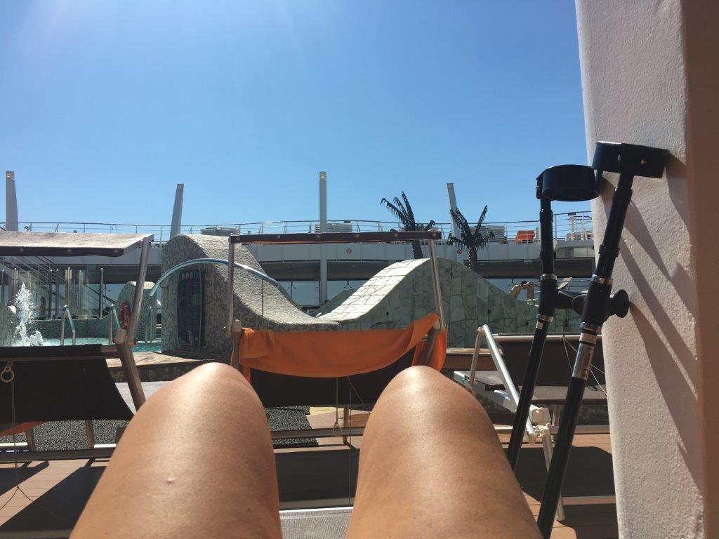 Ik zag de poolguy al naar me kijken van hoe gaat die dit flikken, dit wordt een mooi youtube moment of die zit er over 10 weken nog maar nee hoor ik strompel weer terug met mijn krukken naar het bedje en geniet heerlijk in de zon en na een paar uur druppelen de eerst passagiers weer binnen van hun excursies.