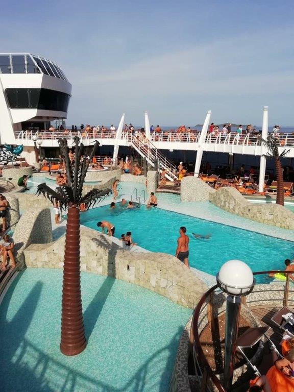 Daarna gaan we terug naar het schip en gaan we heerlijk genieten bij het zwembad. Wat een oase van rust zonder al die mensen. Ik loop richting de bedjes maar passeer ik eerst de ijsbar, de jongen van de ijsbar kent me geloof ik inmiddels al en laat een bakje zien, of ik die wil. Tsja ik wil niet onbeleefd zijn dus natuurlijk pak ik het bakje chocolade ijs aan LOL.