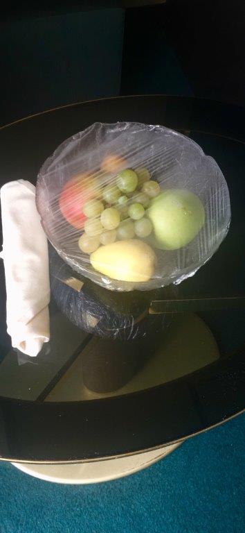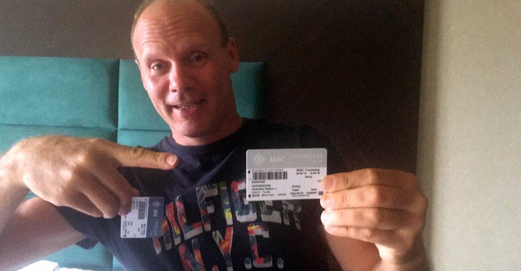 Eenmaal in de hut wacht ons 2 verrassingen een fruitmand voor manlief hij is inmiddels silver member (gek he als hoofdboeker ik denk als iemand die fruitmand kan gebruiken ben ik het wel, maar goed leef je uit) en een douche in het bad, wat dus echt rete onhandig vlak na mijn knie operatie want ik kan hem nog niet buigen. De boot zit mudvol dus ruilen van hut is geen optie. Gelukkig weet ik de ziekenboeg feilloos te vinden op dit schip 😉 Overigens ben ik doodsbang dat ik de hele dag die zilveren pas onder mijn neus geschoven krijg dat is de humeur van mijn man. Bij het boeken hoorde ik het al, ik dacht laat ik het maar niet melden anders heeft hij wel heeeeel erg veel voorpret 😉