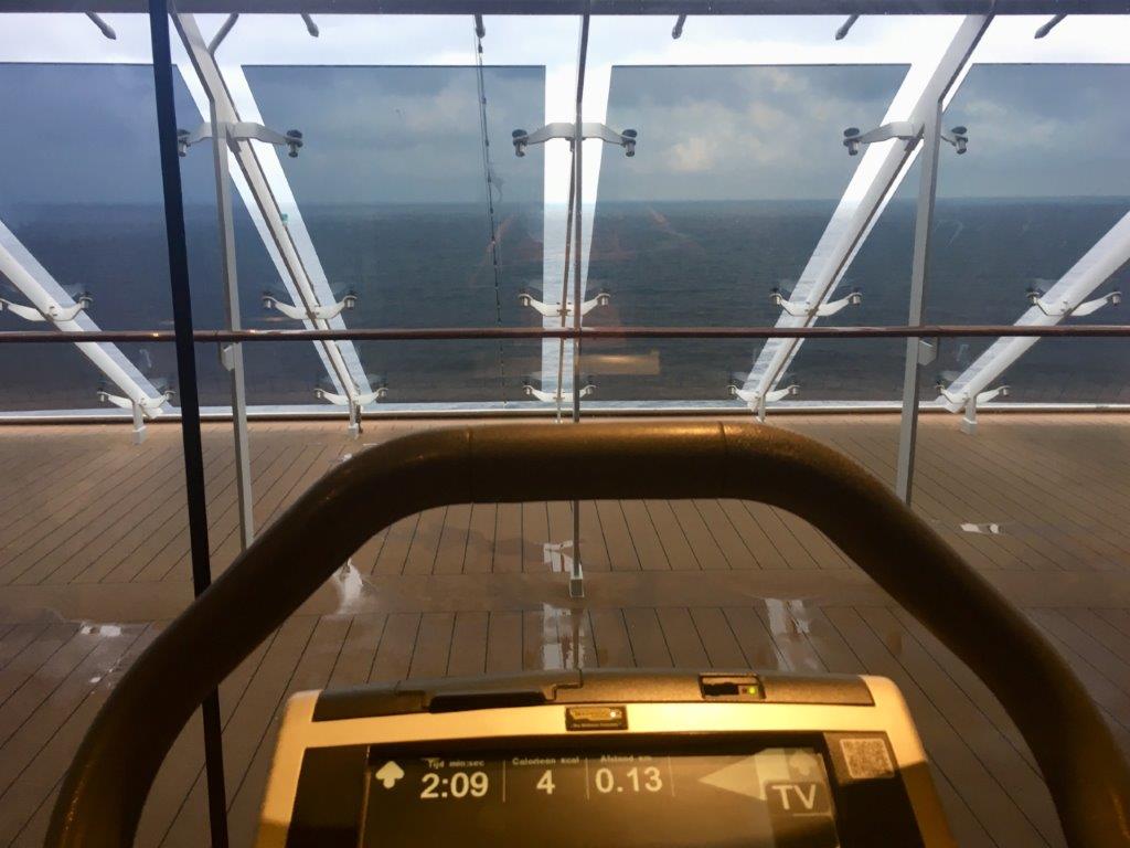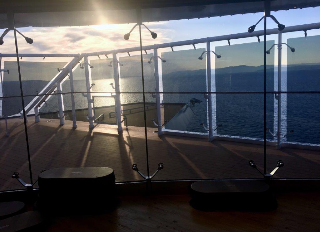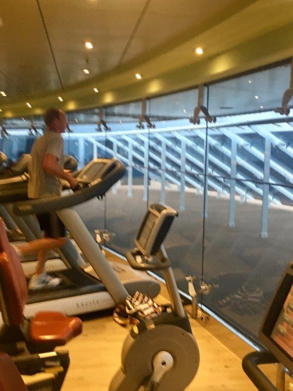 Als we aan het eind van de middag terug komen kleden we ons om, om ons naar de sportzaal te begeven want ik moet keihard gaan revalideren. En er is echt geen mooiere plek dan in de boeg met een overweldigend uitzicht over zee te gaan sporten. Geen excuus om naar een saaie stinkende sportschool te gaan het is er super schoon en van alle laatste moderne apparatuur voorzien. En met al dat lekkere eten is dit in mijn geval helemaal nodig. Manlief was zijn sportschoenen vergeten en zoals elke vakantie kopen we dus weer een paar schoenen voor hem, het lijkt wel of hij het er om doet.