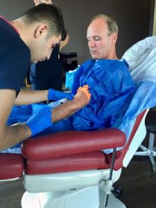 Daarna moest hij een operatie schort aantrekken en plaats nemen op het bed/stoel. Er werd eerst bloed afgenomen dat later gebruikt wordt als PRP plasma. In normaal Nederlands: dat zijn bloedplaatjes die rijk zijn aan plasma. Het is dus geconcentreerd bloedplasma, dat 5x meer bloedplaatjes bevat. Bloedplaatjes zorgen voor een betere en snellere genezing, ook helpt het bij het stollen. In de geneeskunde wordt PRP nu twintig jaar succesvol gebruikt.