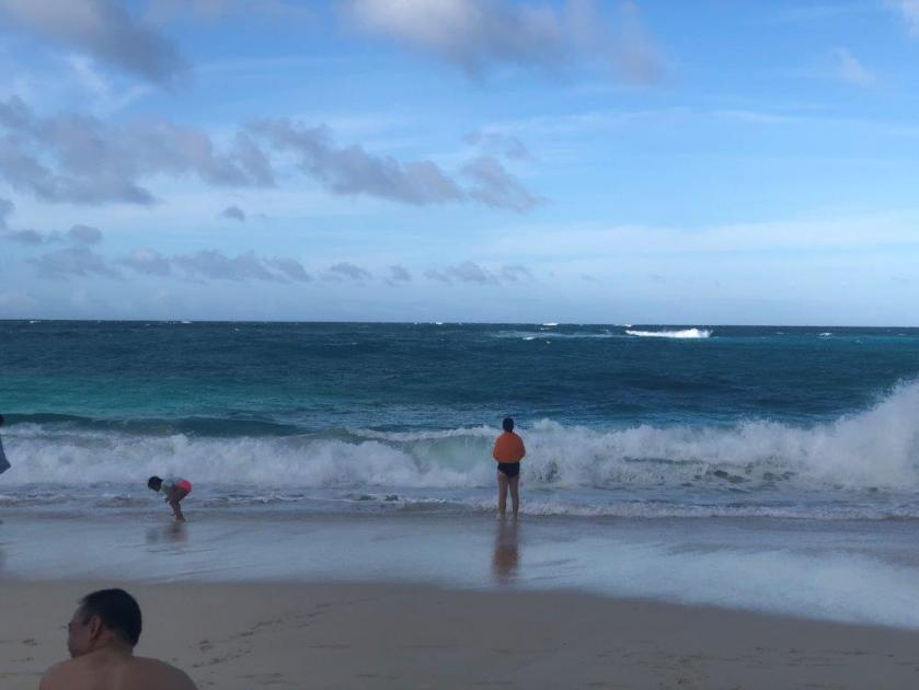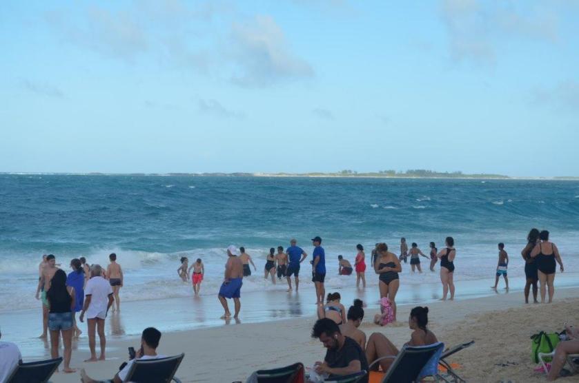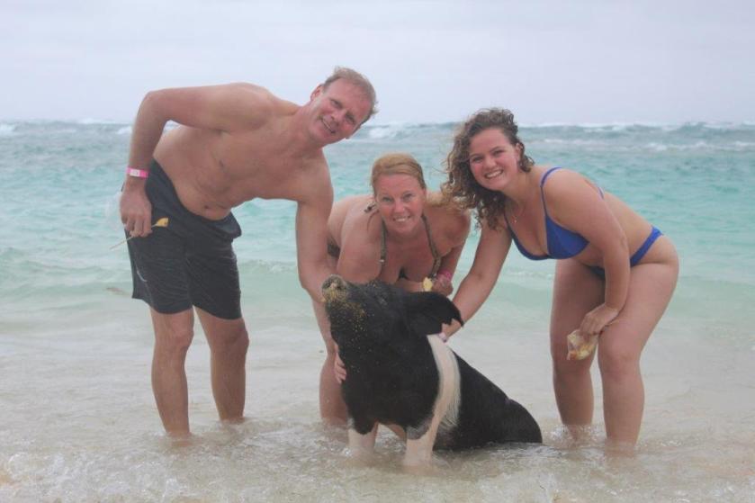 Aangekomen op de verzamelplaats van waar uit de excursie zou vertrekken, troffen we een bijzondere situatie aan; Amerikanen waren in rep en roer en wilde niet mee vanwege het noodweer, de vragen of er zwemvesten aan boord zouden zijn en of we verzekerd zouden zijn lieten we totaal aan ons voorbij gaan. We waren op vakantie en op de bucketlist stond zwemmen met piggies dus hoe dan ook wij waren nog steeds bereid te gaan. Toen we te horen kregen dat de excursie gewoon doorging waren we helemaal in de gloria in tegenstelling tot velen anderen.