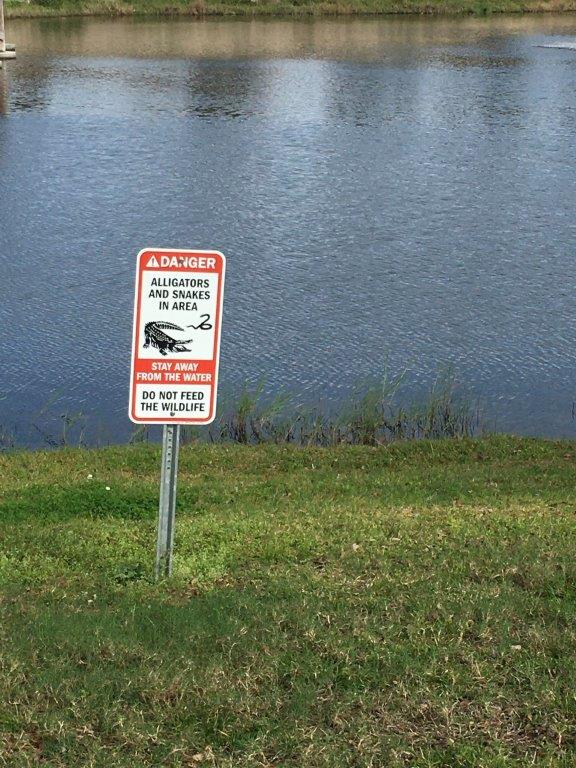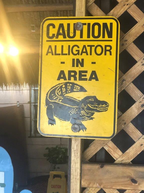 Om daar te kunnen komen moeten we door het donker over een hoog grasveld langs een water met een bord, pas op krokodillen.