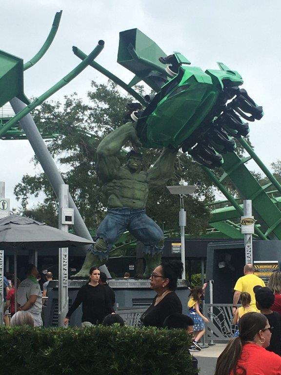 Met de fastpass haasten we ons naar de achtbaan The Hulk waar we langs de rij lopen, binnen no time zitten we in de meest geweldige achtbaan ooit.
