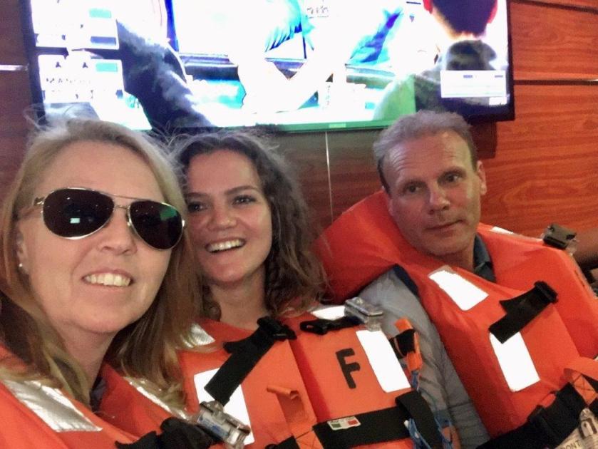 Uiteraard moesten we nog wel deelnemen aan de verplichte reddingsevacuatie- drill, wat eigenlijk echt pure tijdverspilling is, want in tijden van nood en paniek loopt alles altijd anders dan gepland. En ja wij hebben dochterlief mee en een nieuwe jonge kapitein achter het stuur dus hopen we op een klik, zodat we als eerste samen met de kapitein van boord mogen bij nood in zijn eigen gouden tender noodboot.