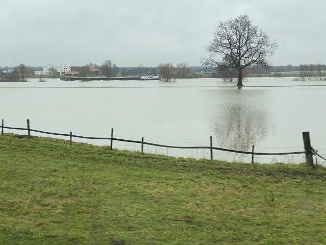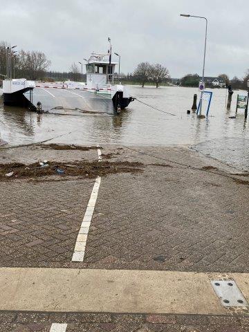 We zien dat de Maas ver buiten zijn oevers is getreden. En toen we de pont wilde pakken bij het dorp Broekhuizen was deze door de extreem hoge waterstand niet meer bereikbaar.