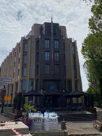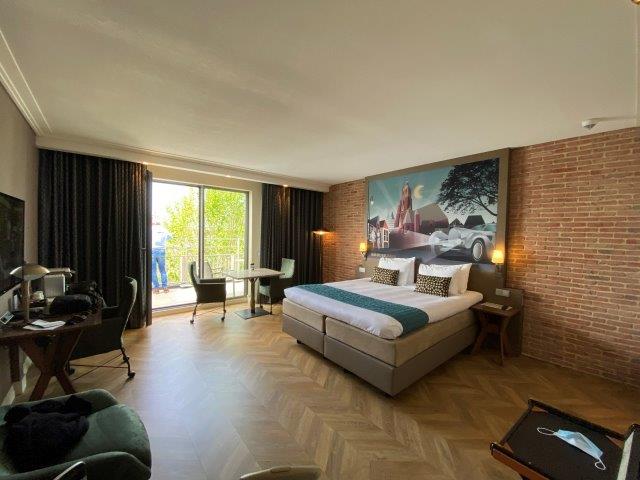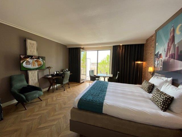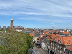 We krijgen een kamer op de bovenste verdieping met prachtig uitzicht over de stad Roermond en kunnen zelfs de outlet zien.