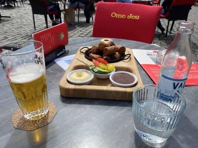 De zon schijnt en we besluiten zo snel mogelijk naar het plein te wandelen, dat ligt op nog geen 5 minuten lopen om daar op een terras neer te ploffen en lekker.