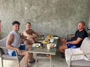 We zitten in de zon en warmen lekker op en genieten van het lekkere eten.