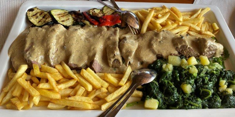 We nemen plaats in het restaurant met een prachtig mooi uitzicht over de baai en bestellen chateau briand voor 4.