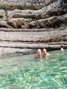 Daarna varen we naar de Green cave en de blue lagoon. Het wordt een pittig tochtje maar we blijven er vrolijk onder. Hoewel sommige andere passagiers daar vast andere herinneringen aan beleven.