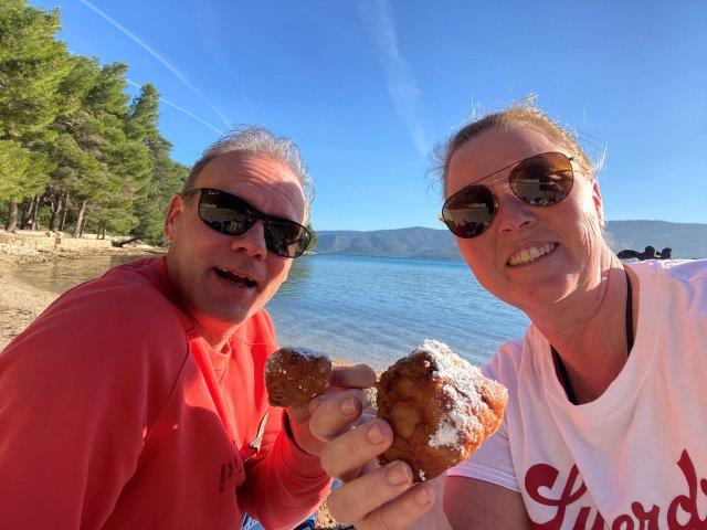 We gaan naar ons strand om de hoek waar we onze roes uitslapen en meegebrachte oliebollen op het strand eten.