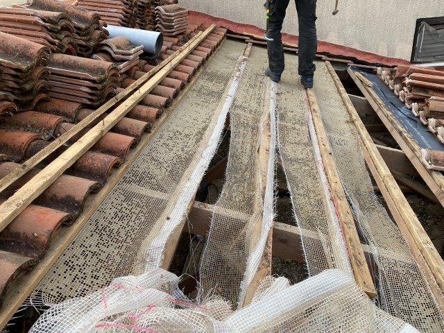 We hebben dit nooit eerder gedaan maar al doende leren we. De uitdaging zit hem vooral in het terug plaatsen van de oude pannen. Een aantal sneuvelen helaas maar onze lieve overbuurman weet nog een aantal pannen te regelen.