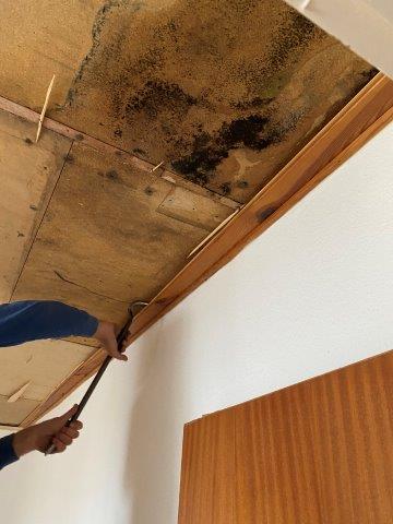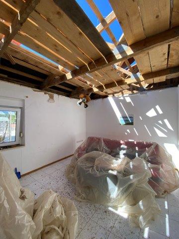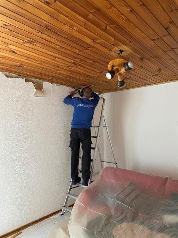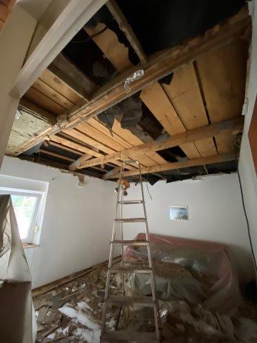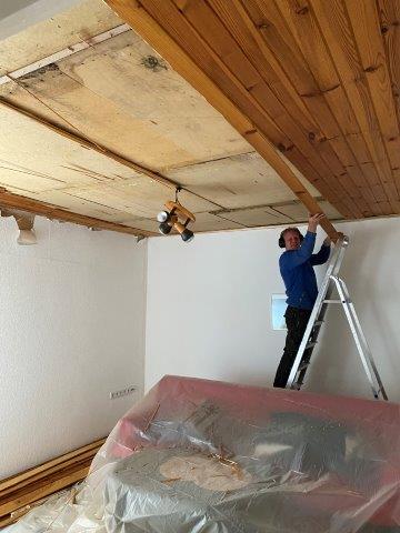 Het plafond in de woonkamer moet eruit. Zo kunnen we van binnenuit het dak van nieuwe isolatie voorzien.