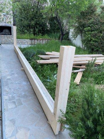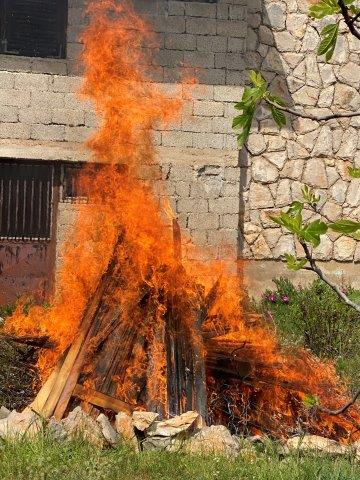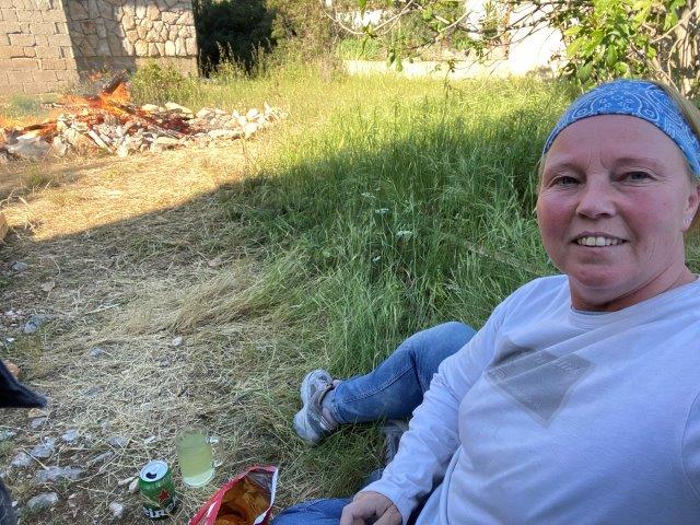 Het is goed weer en weinig tot geen wind dus kan ik de oude schroten, plafond platen en houten balken mooi in de achtertuin op fikken.