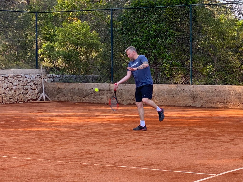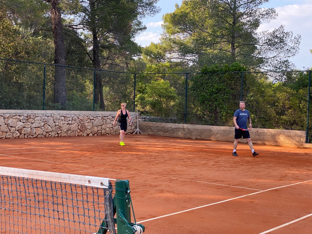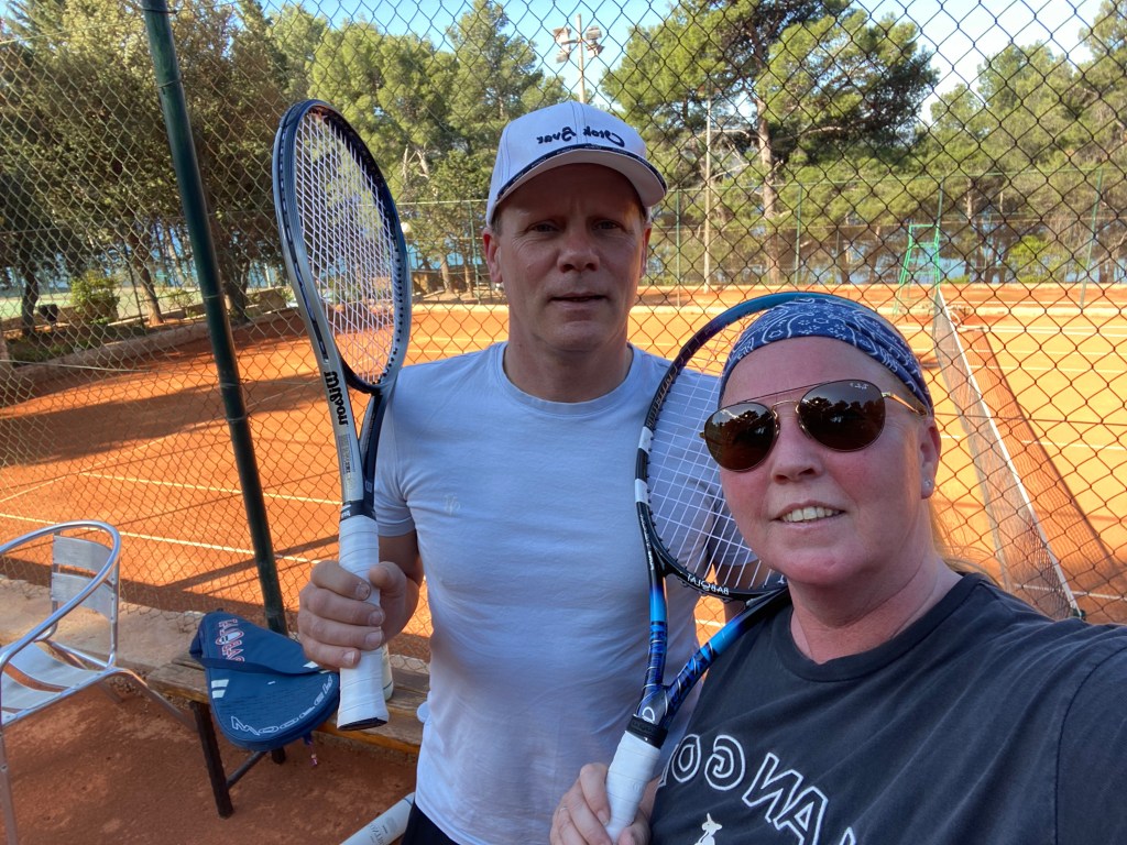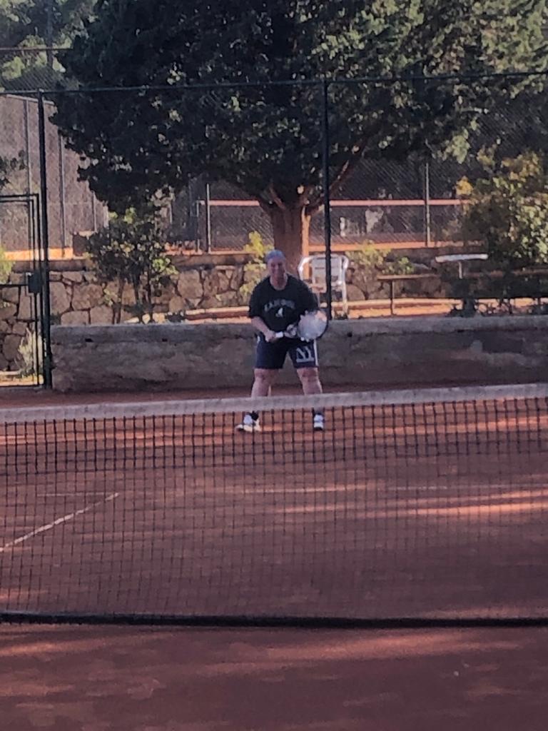 Daarna gaan we weer een paar uurtjes tennissen en komen onze vrienden ook later die kant op. We gaan met zijn vieren dubbelen. Althans iets wat er op moet lijken. Wat leidt tot grote hilariteit. Uiteindelijk doet de baan naast ons ook ongewenst mee. Daarna doen we nog even heerlijk een drankje op een van de mooiste plekken van ons dorp. ps we missen maar 1 bal van de 8!