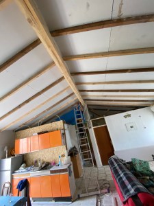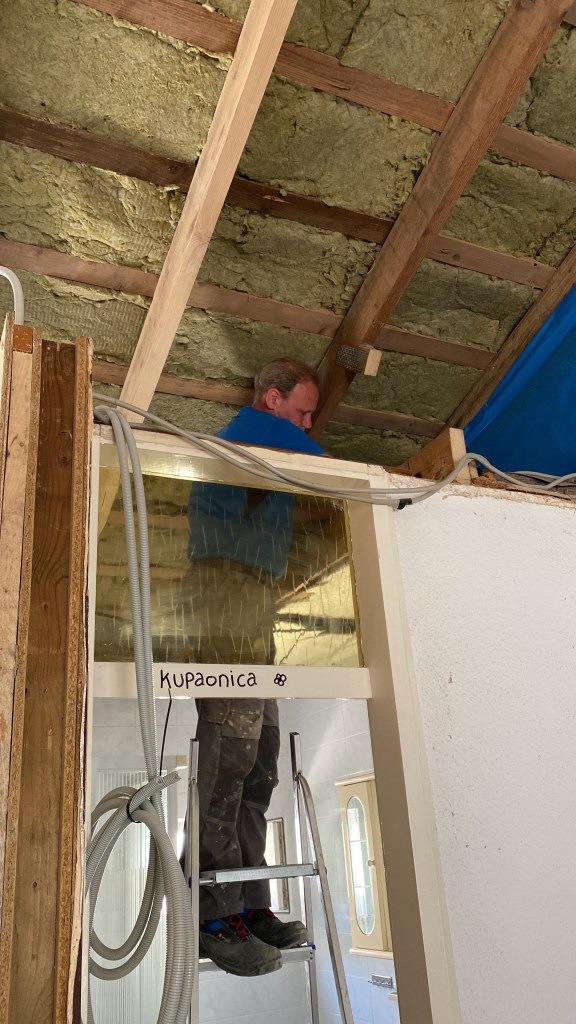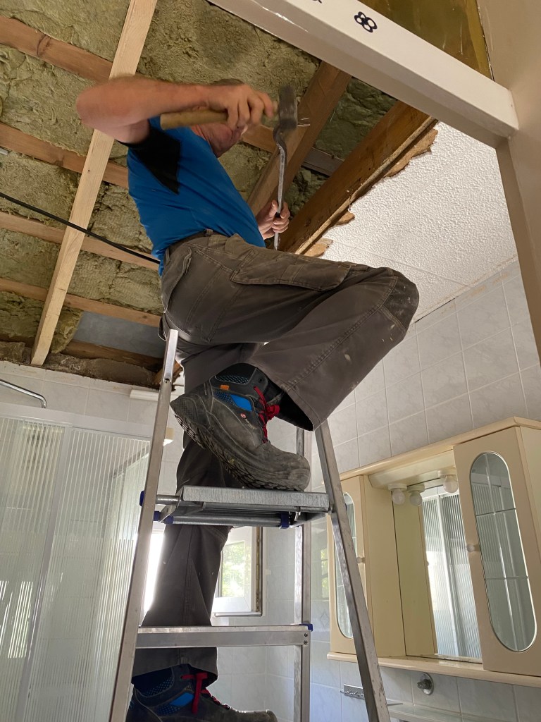 Daarna pakken we samen door met het verwijderen van het plafond van de badkamer zodat we makkelijk bij het dak kunnen om het laatste stuk van het dak te isoleren.