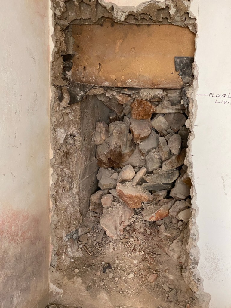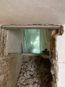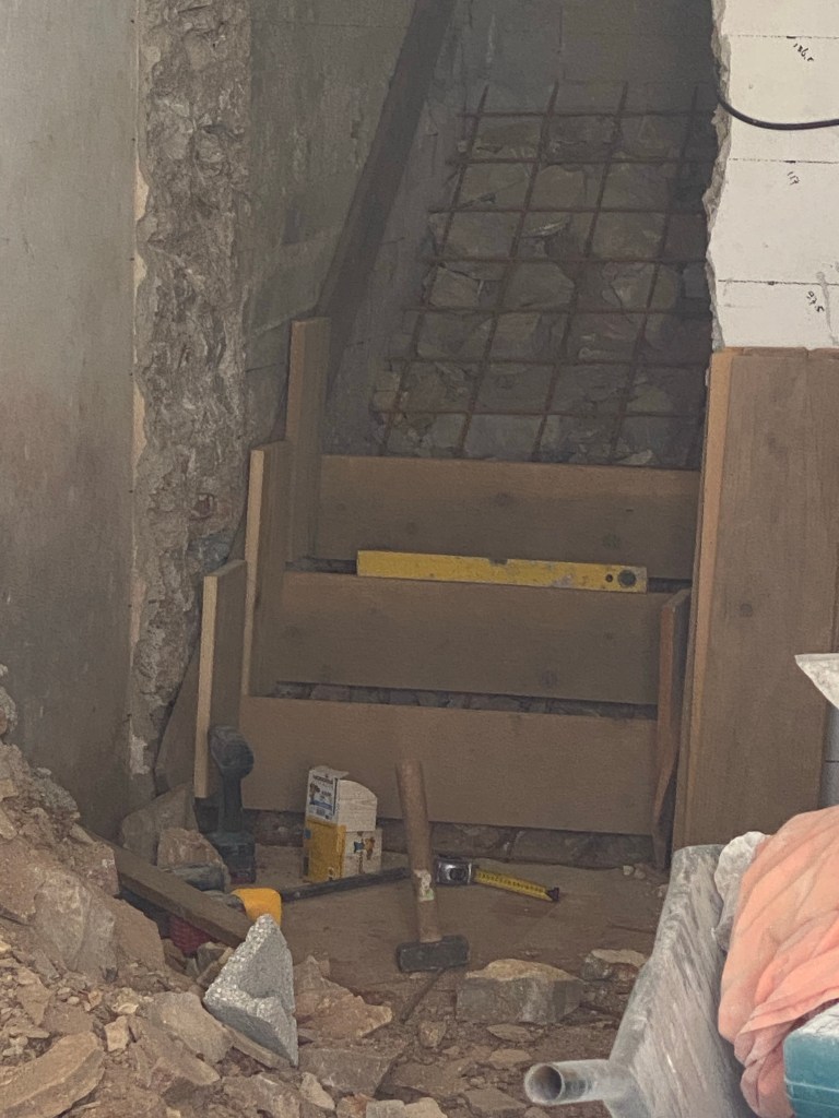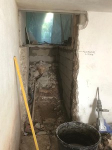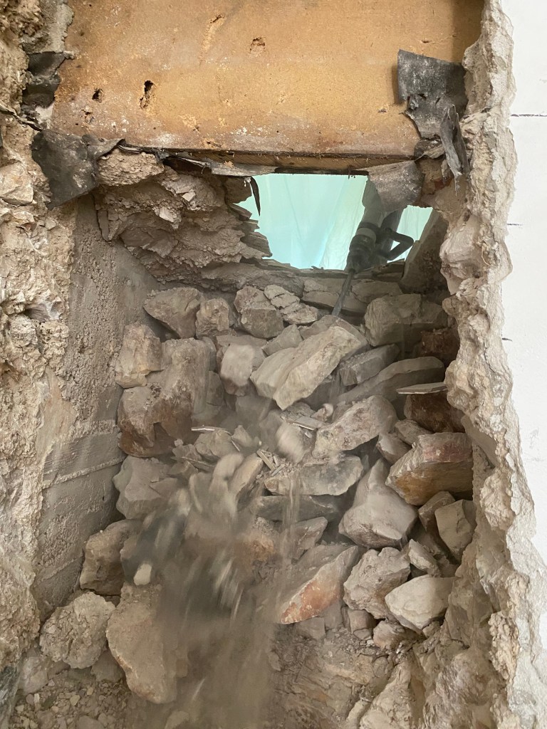 Gelukkig hadden we eerder een stenen latei meegenomen om een deel op te vangen dus wordt er nog gehakt en wordt de latei vast gezet met cement beton. Nu wordt er een deel van de muur opgevangen.