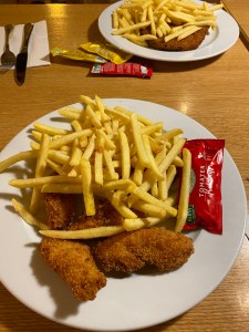 Wat een toeval, het lieveling korstje van manlief. Dus smerige vette schnitzel mit pommes voor manlief, it is! Hij blij, zijn vakantie is goed begonnen. Ik hou het bij iets van gefrituurde nep chicken nuggets mit pommes. Waarom niet gewoon friet dat klinkt toch ook Duits?