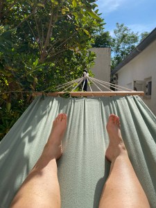 Ik begin alvast stilletjes met schoonmaken van het huis. Daarna zet ik de hangmat in elkaar en geniet ik van de zon. Het is al goed warm en de hangmat blijkt een succes.