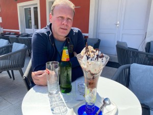 Er zijn genoeg andere klussen. Dus rijden we terug, het is een korte rit van een paar kilometer. Maar eerst pakken we een terrasje in Jelsa bij mijn favo ijstent.