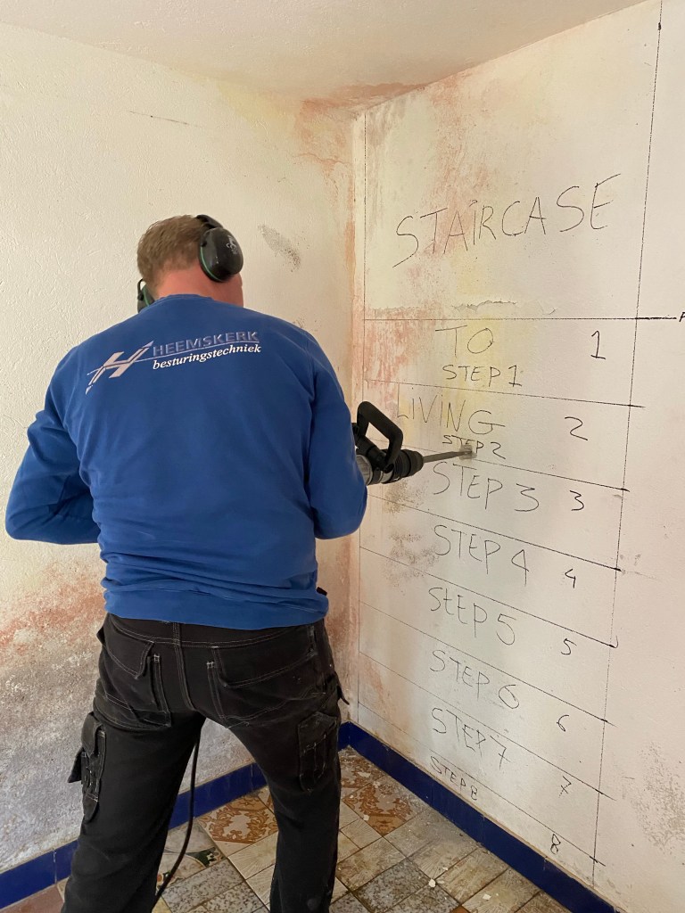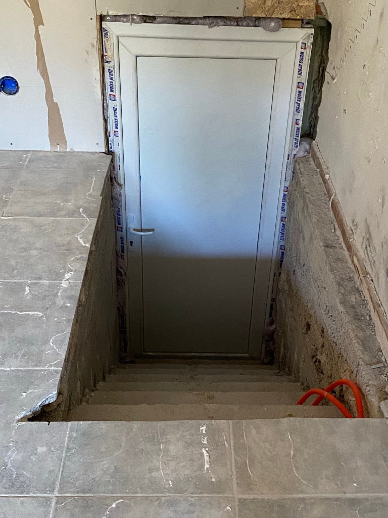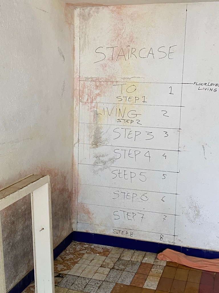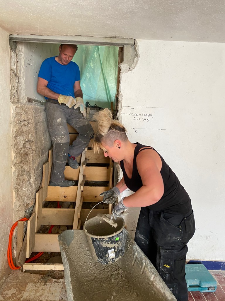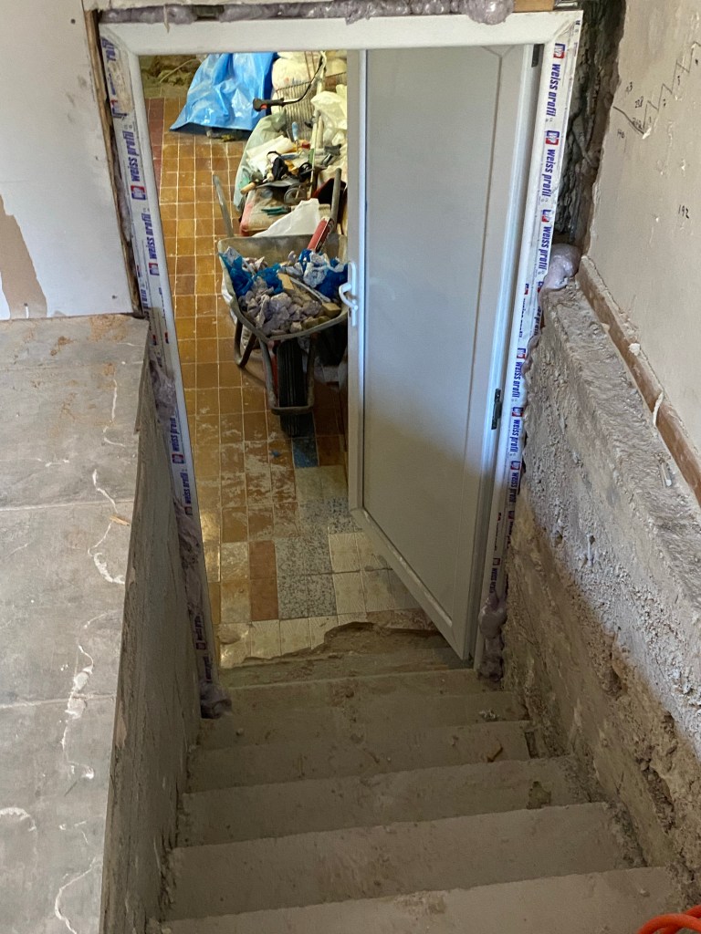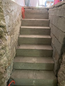 Er staat een grote klus op de afvink lijst namelijk een trapgat creëren vanuit de woonkamer omlaag de garage in naar de kelder. Nu moeten we nog buitenom over straat. Inmiddels ben ik alle schaamte voorbij en loop ik met een wasteil ondergoed over straat al groetend naar de buren en toeristen. Mocht ik onderweg een buur tegen komen zet ik mijn teil met vuile was op de grond en kletsten we gezellig naast mijn vieze was.
