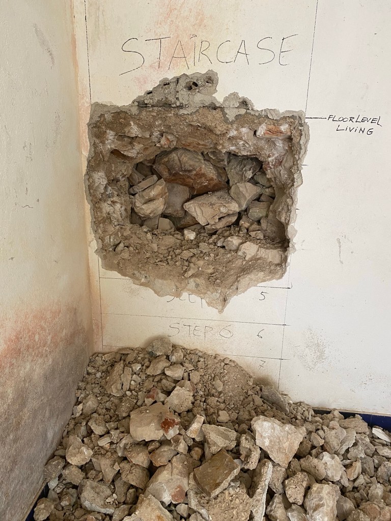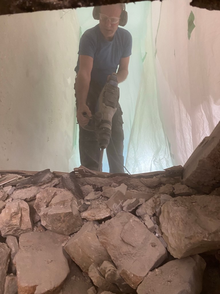 Nu we een flinke opening hebben zien we dat er een redelijk dunne verdiepingsvloer op ligt, maar dat deze nu deels zweeft door het hakken van het gat.