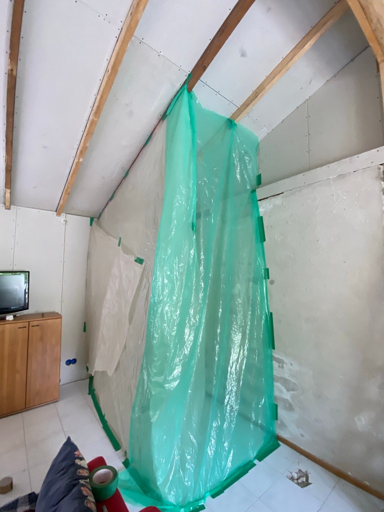 Daarna maakt manlief een goed bedoelde tent binnen in de woonkamer om de ergste stof uit de woonkamer te houden.