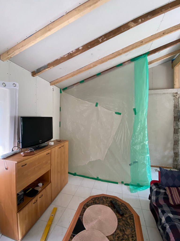 En inderdaad de volgende dag opstaan was geen makkie en de hele dag was eigenlijk zo een dag dat je denkt wat ben ik nou aan het doen?! Maar ondanks alles klussen we door en plaatsen we nog een voorzet wand van hout en daaroverheen gipsplaten in de achter slaapkamer.