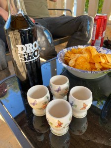 Dropshot uit eierdopjes met chips kaas worst en stoffige kleding. Wat een feest !! We doen nog net geen stoelendans.