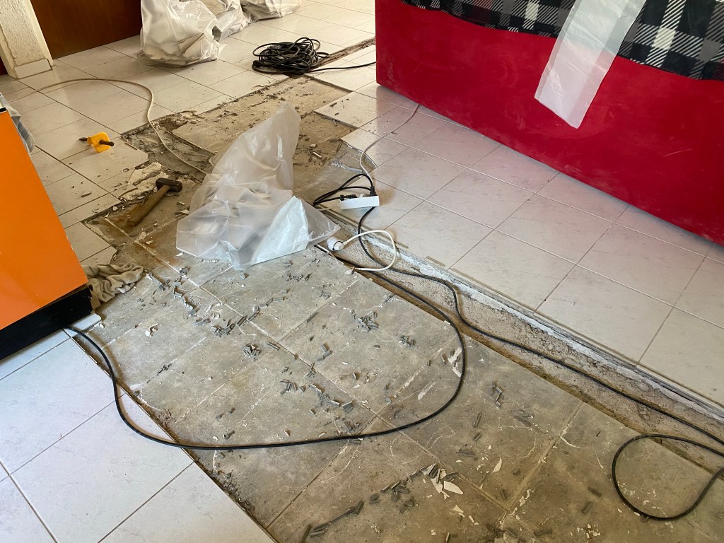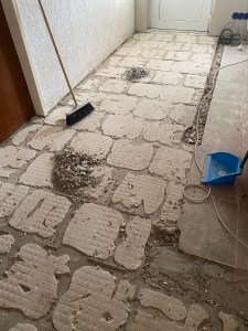 Als we na een paar uur terug gaan naar de overkant gaat manlief weer door met het nodige hak werk. En ik ga aan de slag met het uit hakken van de oude vloertegels in de woonkamer, de keuken en de hal. Makkelijk is anders maar het lukt. Morgen verder met een kleine kango.