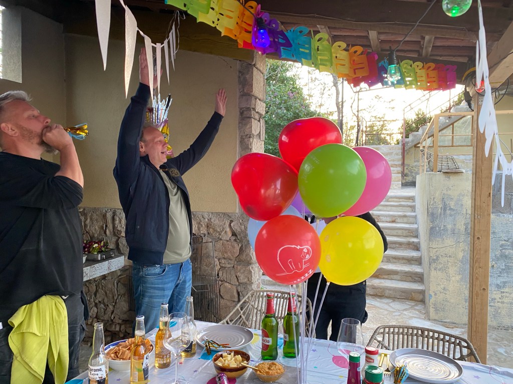 Als onze vrienden komen kijken spreken we nog even wat technische dingen door, althans de mannen. Naast de uitleen service die zij bieden is natuurlijk super handig om tips te krijgen van iemand met verstand van zaken. Daarna proosten we zoals we alle dagen doen op Ann’s verjaardag en krijgt ze haar volgende kado.