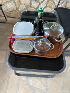 De volgende dag is aangebroken als we de voorbereidingen treffen voor de volgende klus. Manlief brengt even de lege pannetjes naar de overkant, maar blijft toch wel langer weg dan gedacht.