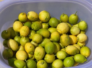 Als ik aan de voorkant de tuin snoei pak ik gelijk de citroenboom mee want die hangt helemaal vol met citroenen.