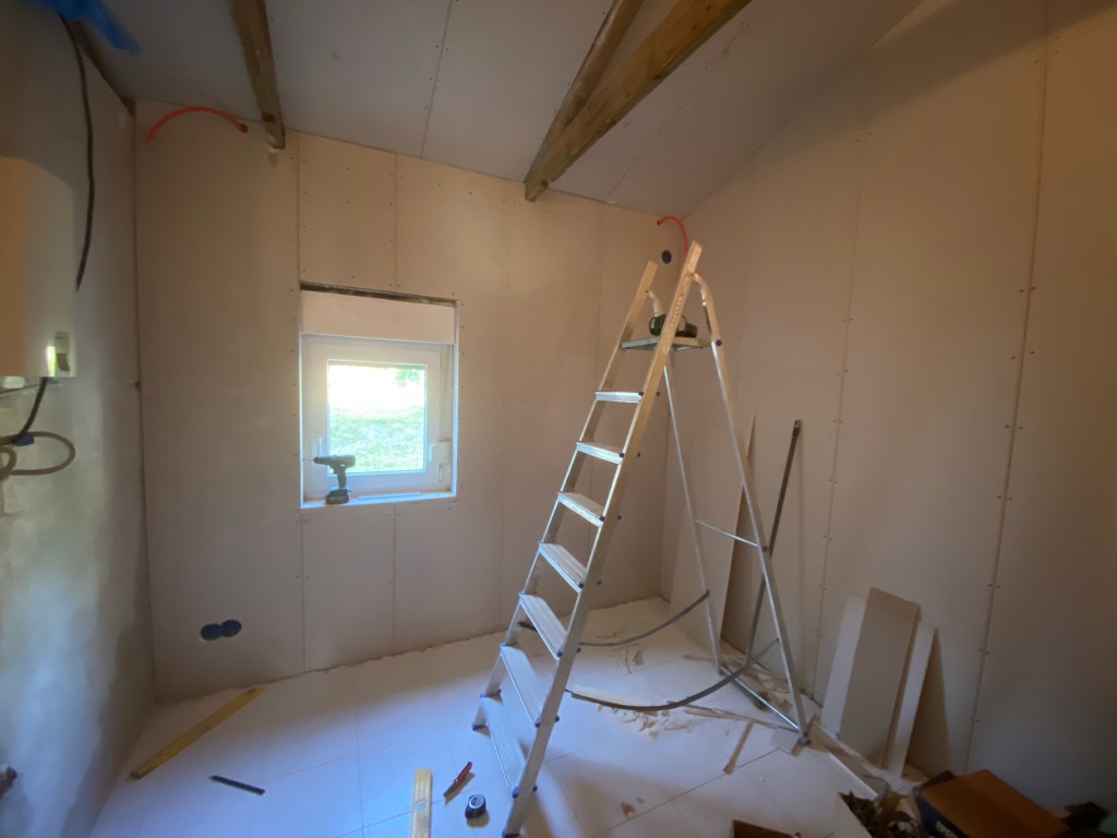 Als de laatste gipsplaat erin gaat is het feest. Eindelijk weer een grote klus van de lijst af. Nu is de buitenkant waterdicht en de binnenkant geïsoleerd en klaar om af gestukt te worden.