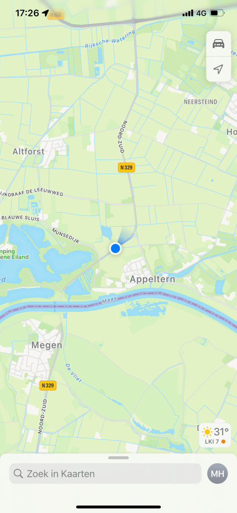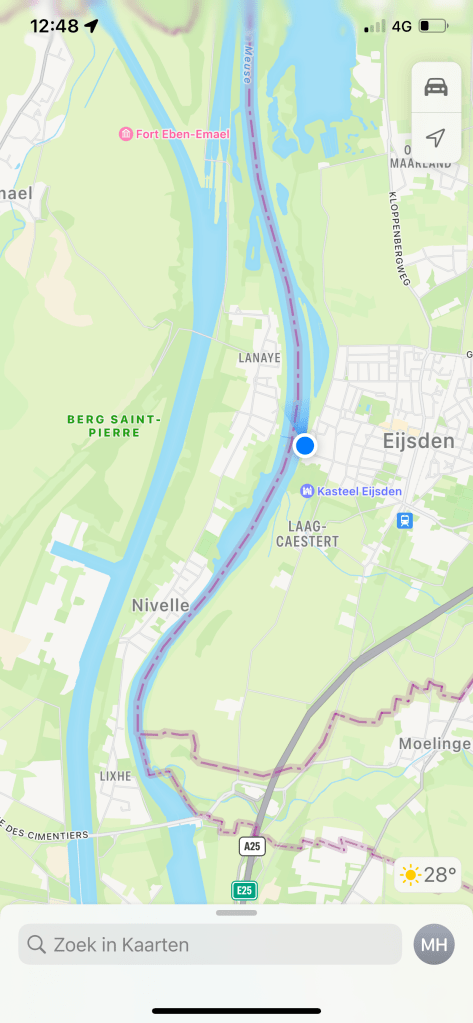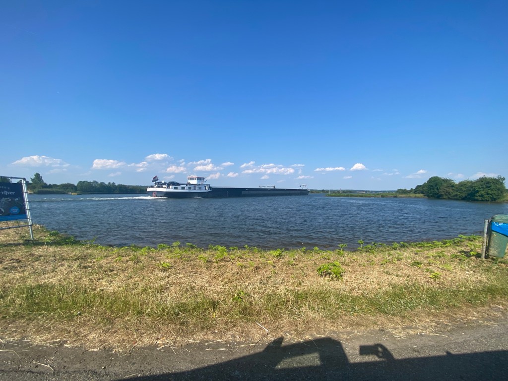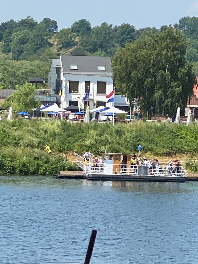 De maas blijkt hier de erfgrens tussen Nederland en België. We zien aan de overkant België liggen.