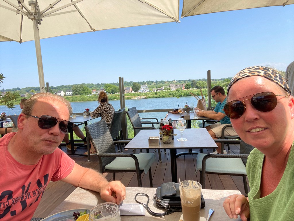 We parkeren de auto en zien een leuk terras aan de Maas met de naam Oan t bat, http://www.oantbat.nl