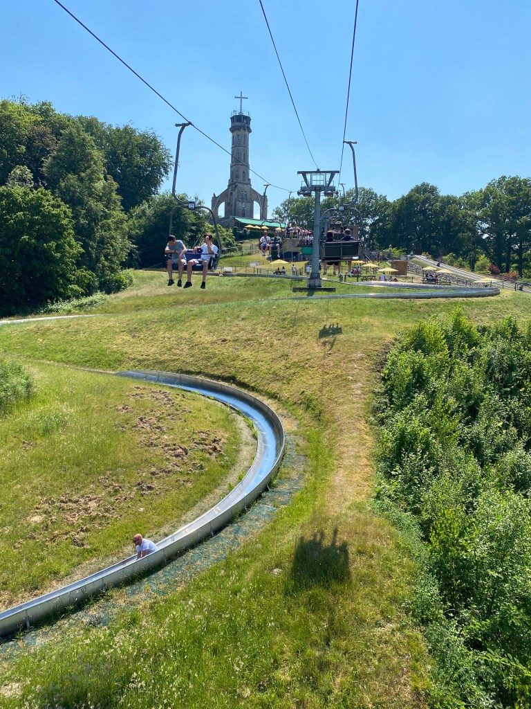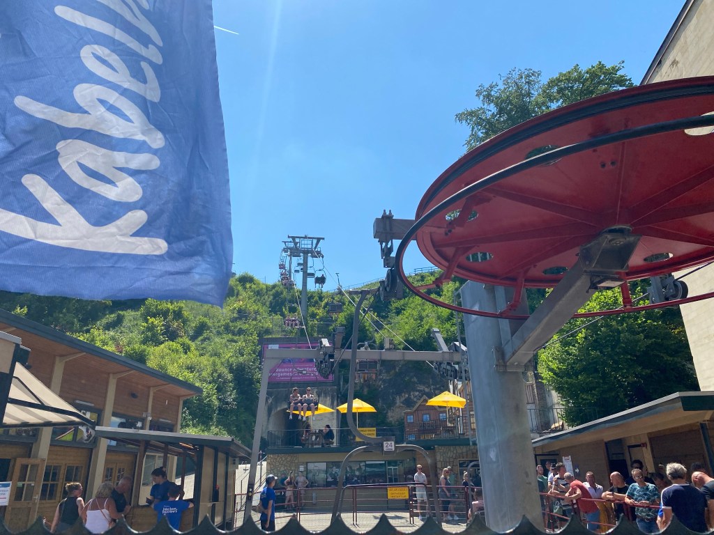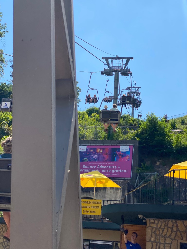 We parkeren de auto in de straat van de kabelbaan. In een gekke bui besluiten we de “skilift” te nemen om het gevoel van de wintersport niet helemaal te vergeten.