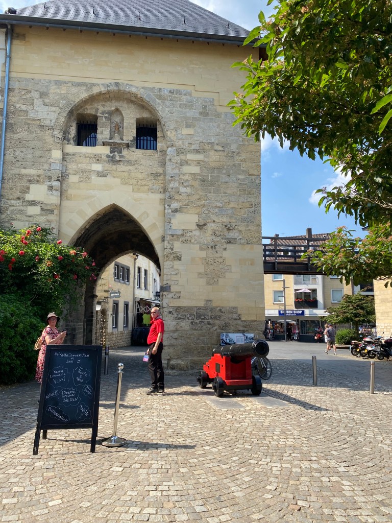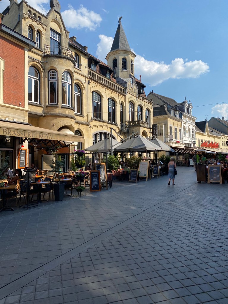 We wandelen het oude centrum van Valkenburg in, waar het inmiddels enorm druk is geworden. Overvolle terrassen met mensen die aan het genieten zijn. Vrijgezellenfeestjes met mensen die uitgedost zijn in de heetste kostuums en dat op de heetste dag van het jaar.