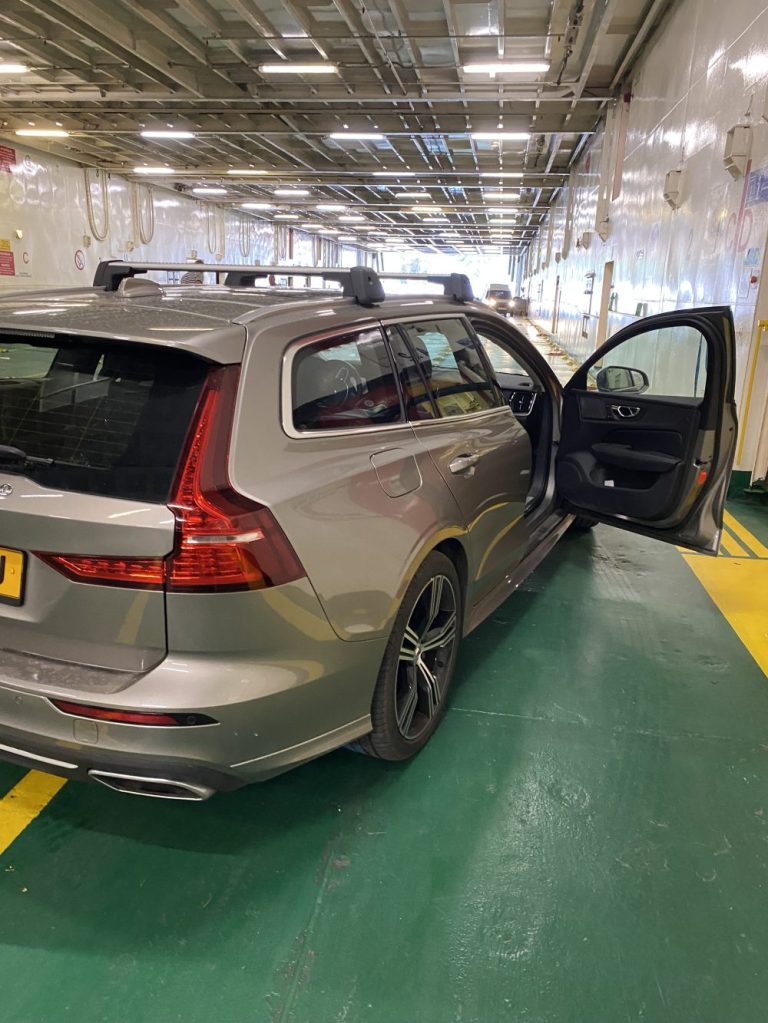 Wel moeten we ook nog wat afgooien bij de Broaten voordat we naar de ferry rijden. Dus na een pittig afscheid van onze lieve overbuurtjes gingen we er vandoor. We bellen onderweg of de Broaten ergens in de buurt zijn en puur toeval of niet komen we elkaar bij de bushalte in het dorp tegen. We geven de spullen af en verklaren ons haastige vertrek.